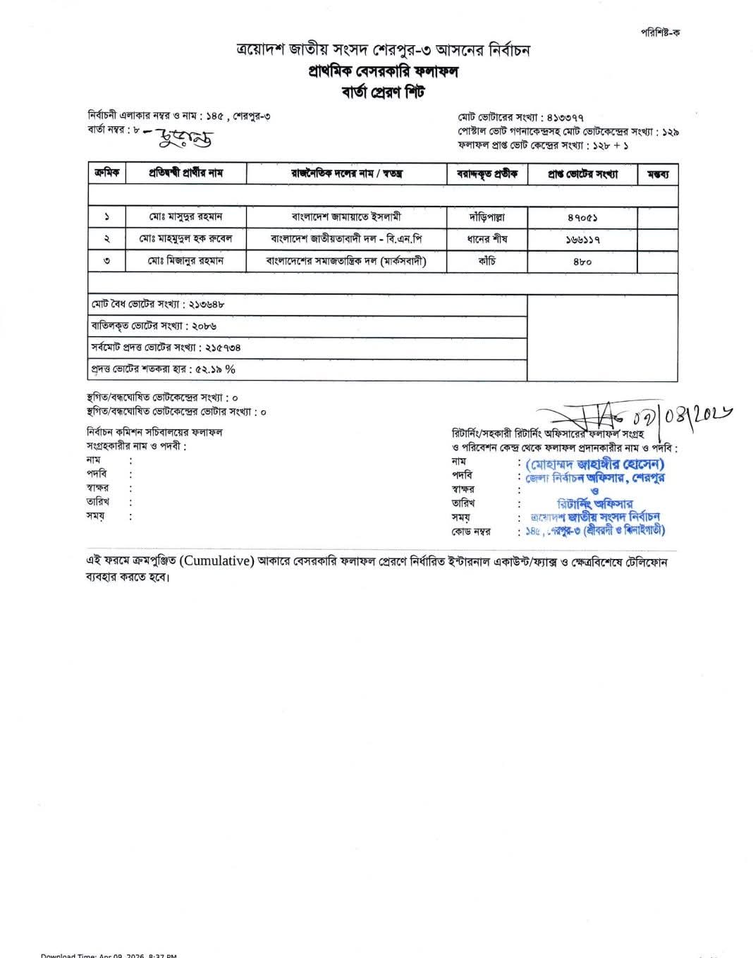বৃহস্পতিবার (৯ এপ্রিল) রাতে শেরপুর জেলা নির্বাচন কর্মকর্তা ও রিটার্নিং কর্মকর্তা মোহাম্মদ জাহাঙ্গীর হোসেন এ ফলাফল নিশ্চিত করেন।