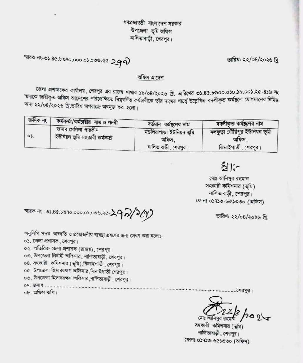 গত ২২ এপ্রিল নালিতাবাড়ী উপজেলার সহকারী কমিশনার (ভূমি) মো. আনিসুর রহমান স্বাক্ষরিত এক অফিস আদেশে এ তথ্য নিশ্চিত করা হয়েছে।